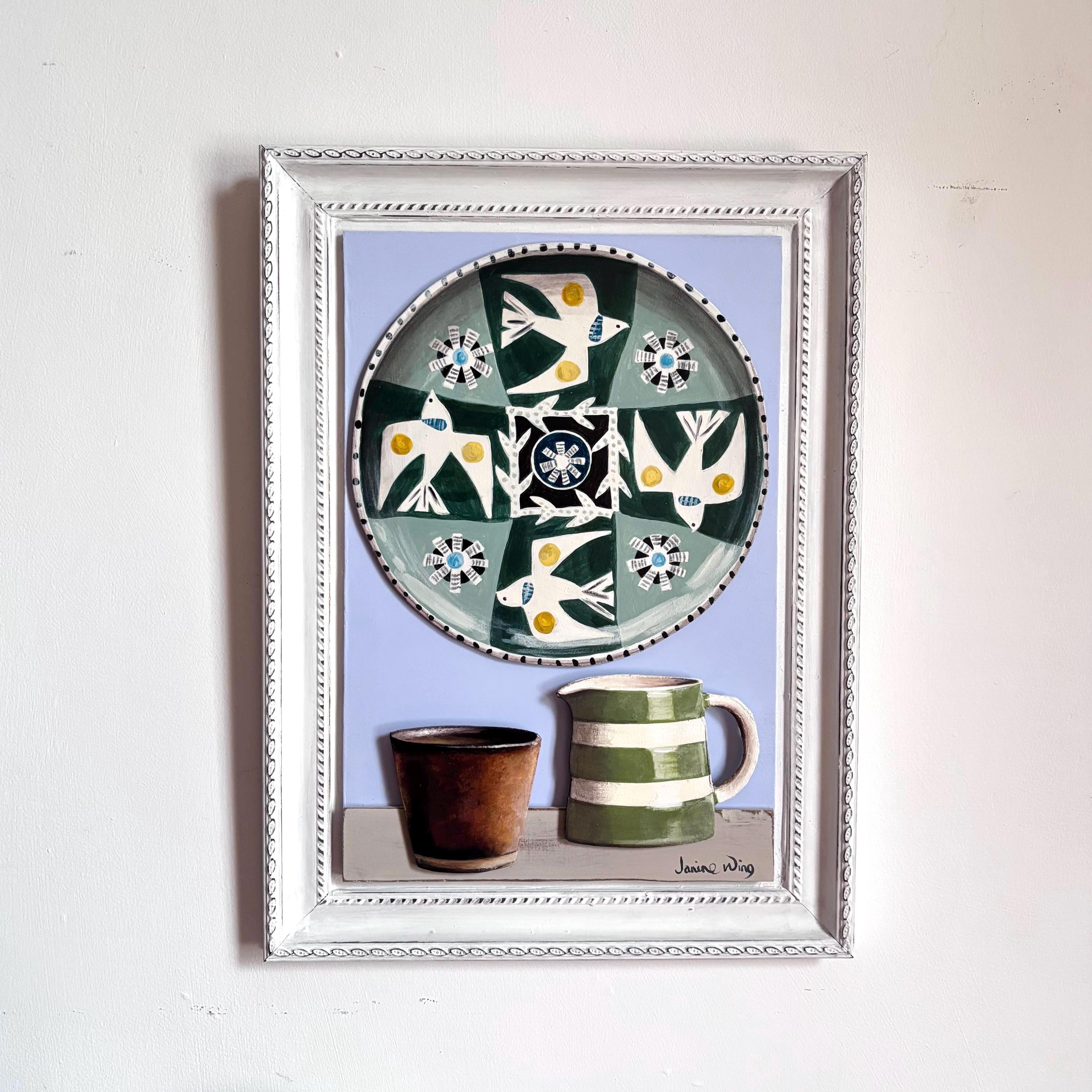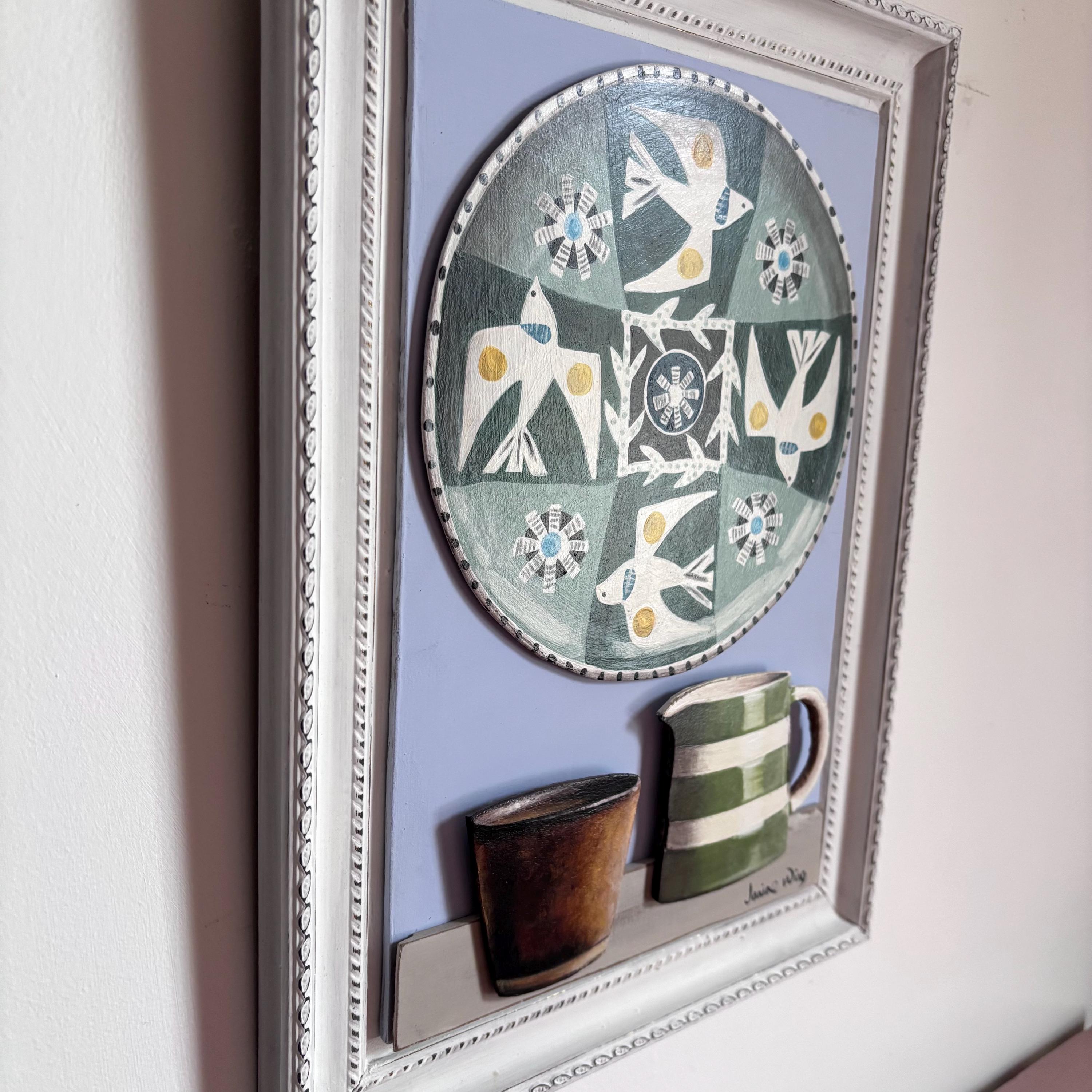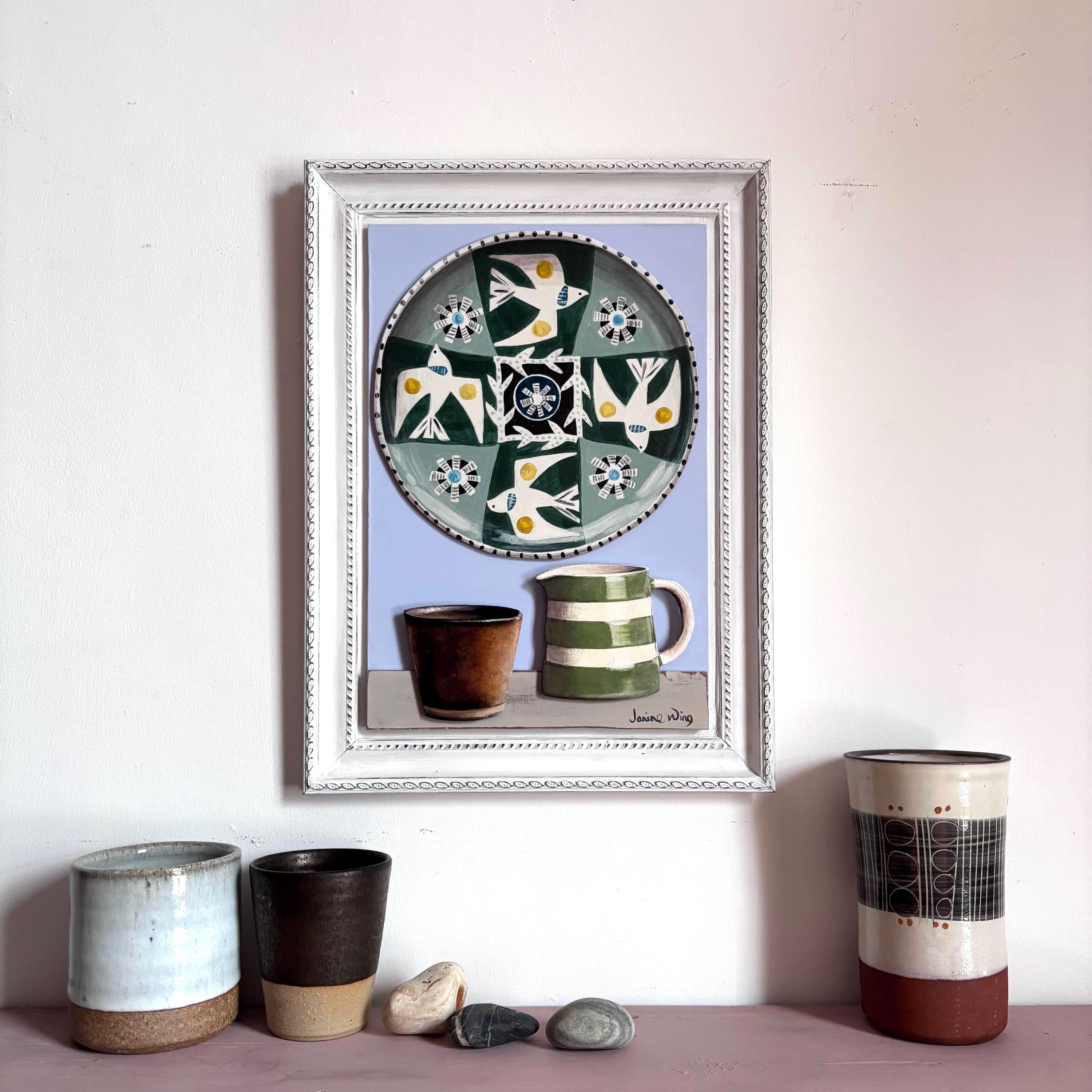 Still life shelf with Jane Ormes plate, Gail Cooper and Cornishware jug.