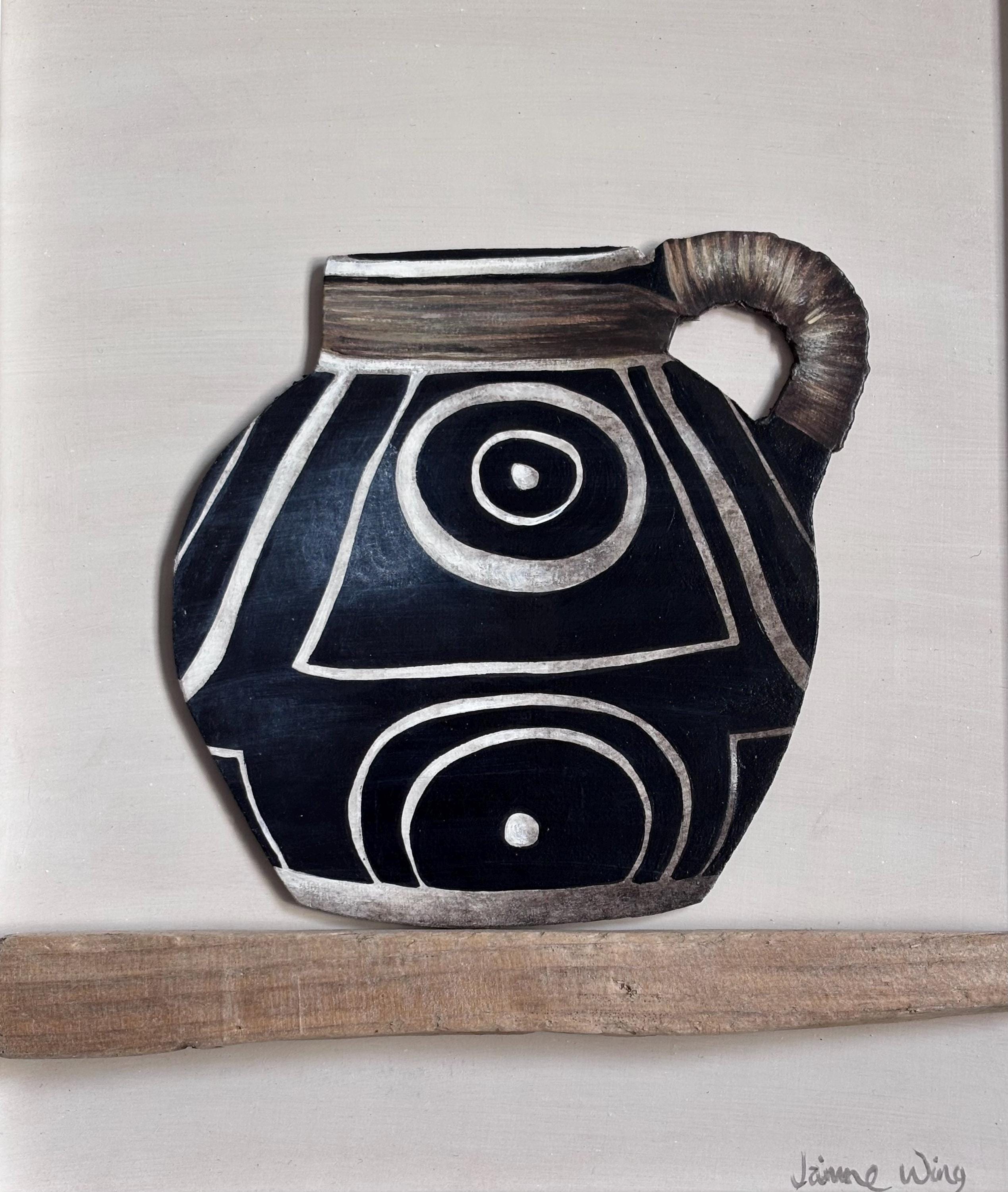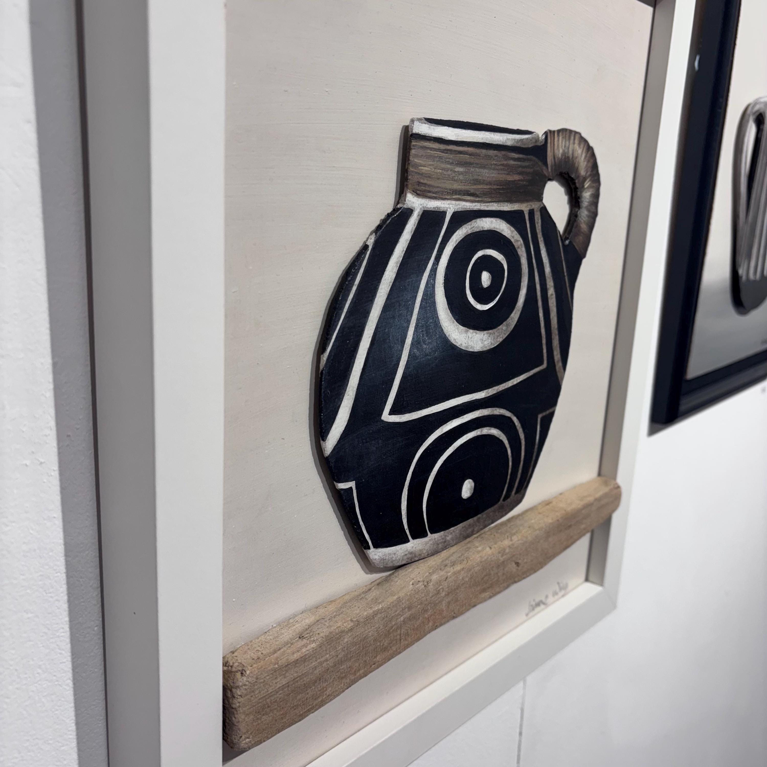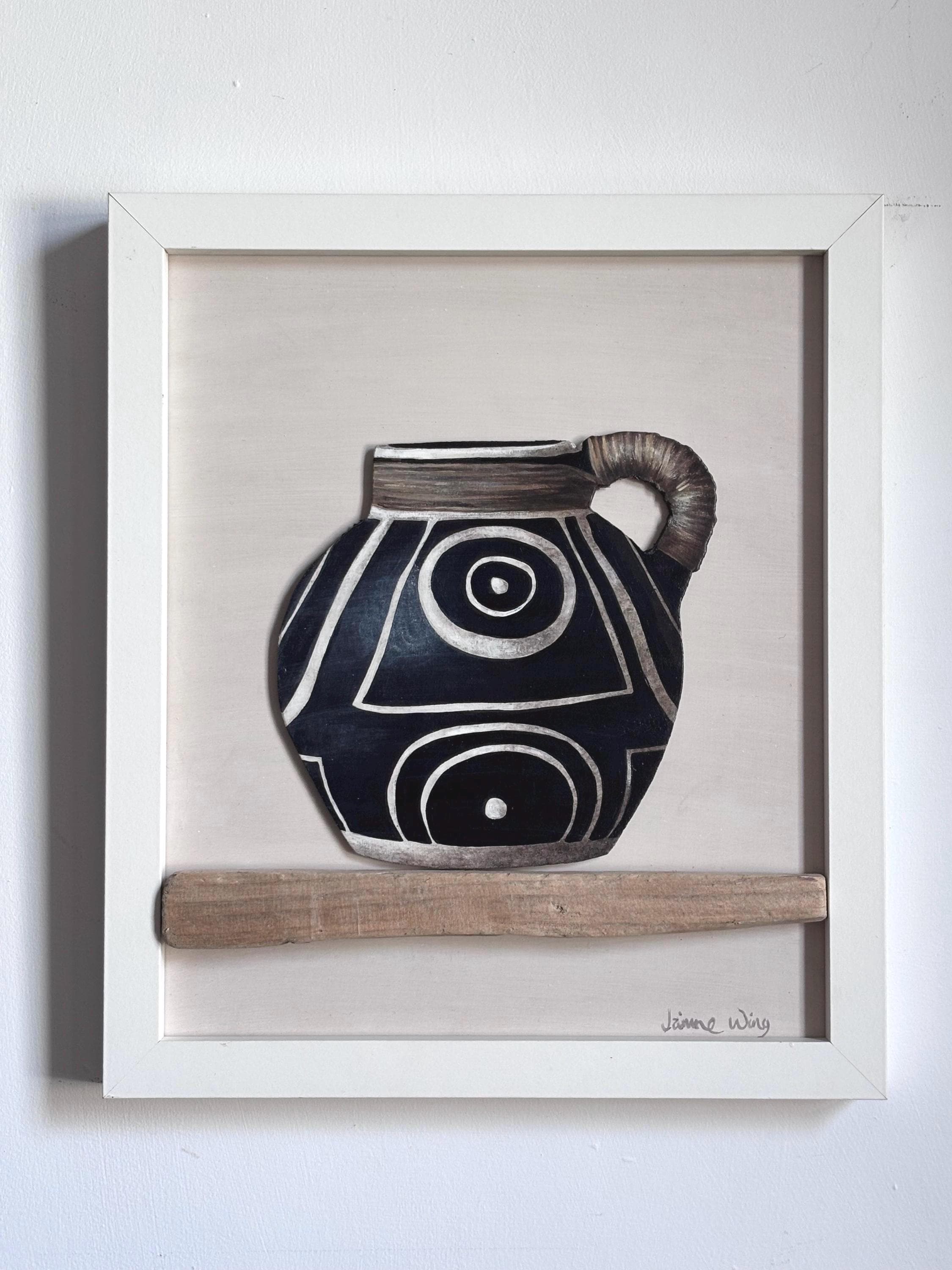 - Acrylic on board and driftwood shelf. Jug is cut out and mounted on board for 3d effect.