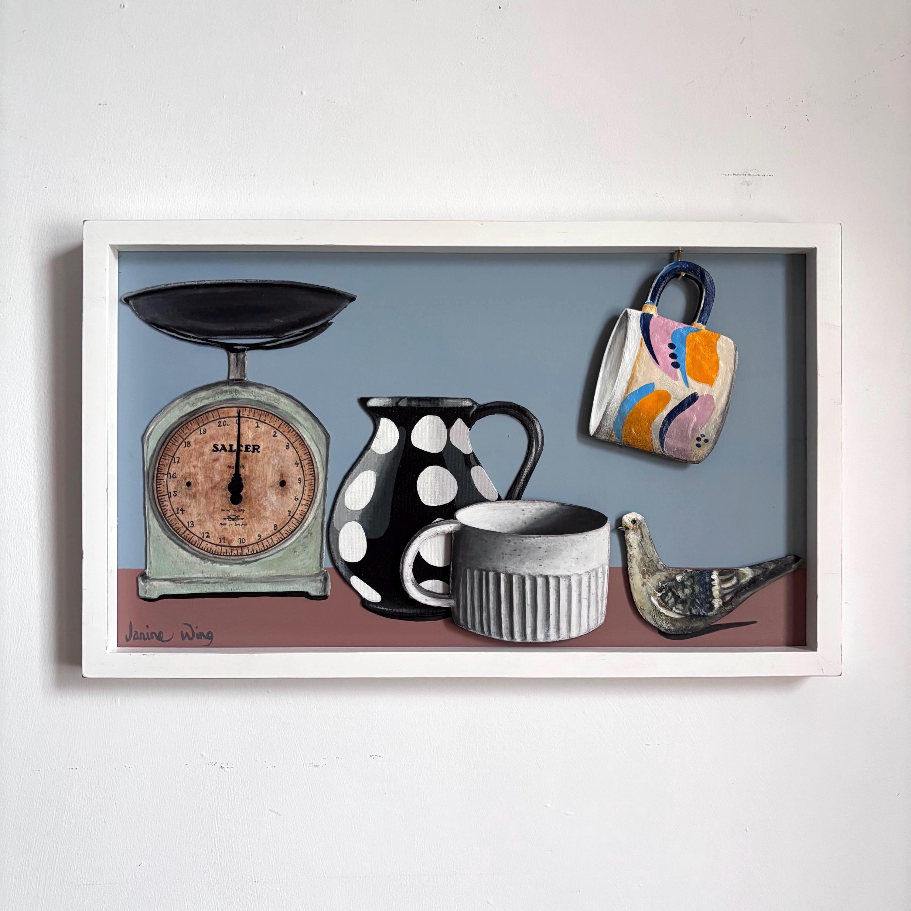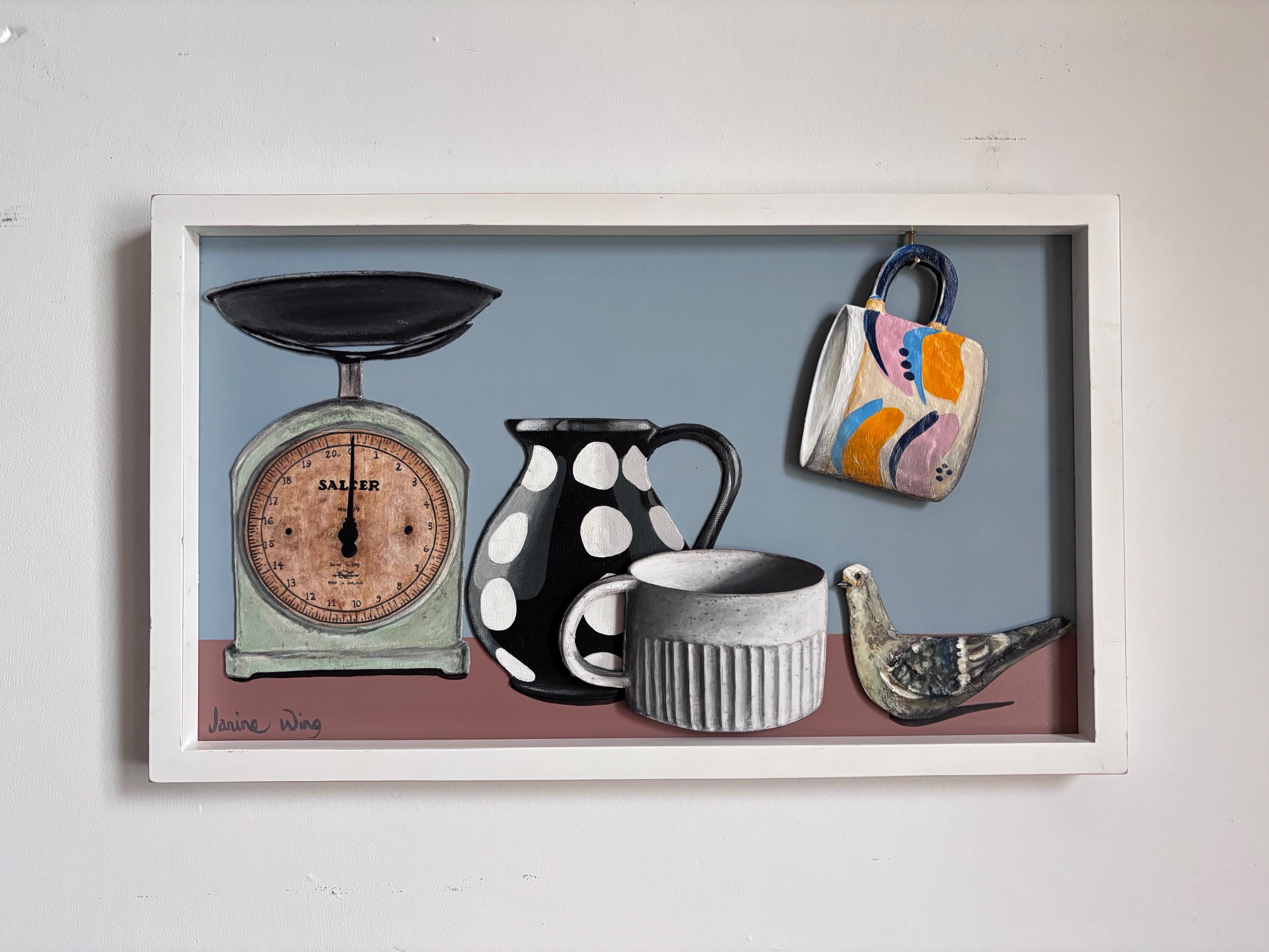 - Acrylic on board. Objects are cut out and mounted on board for 3d effect.