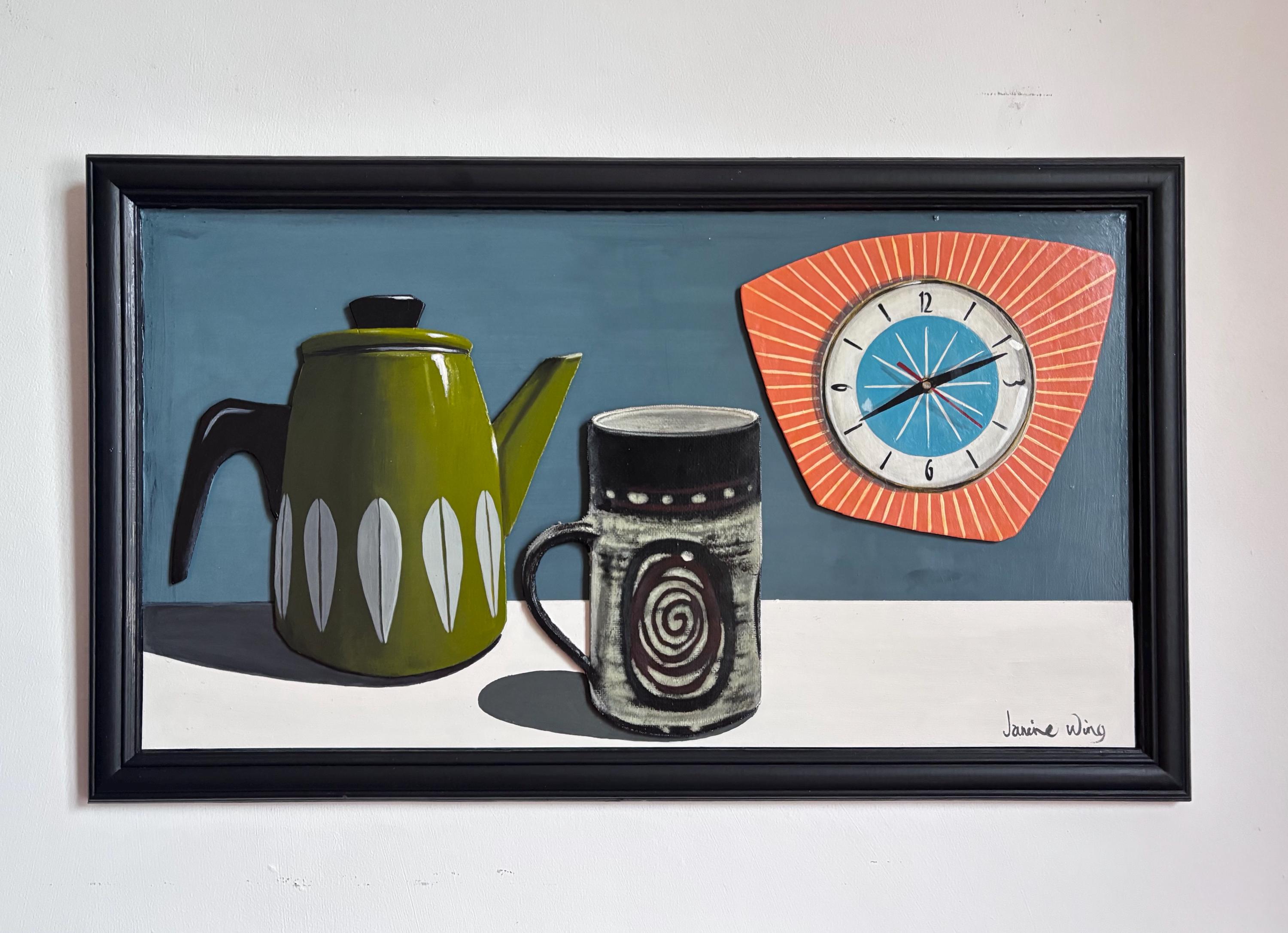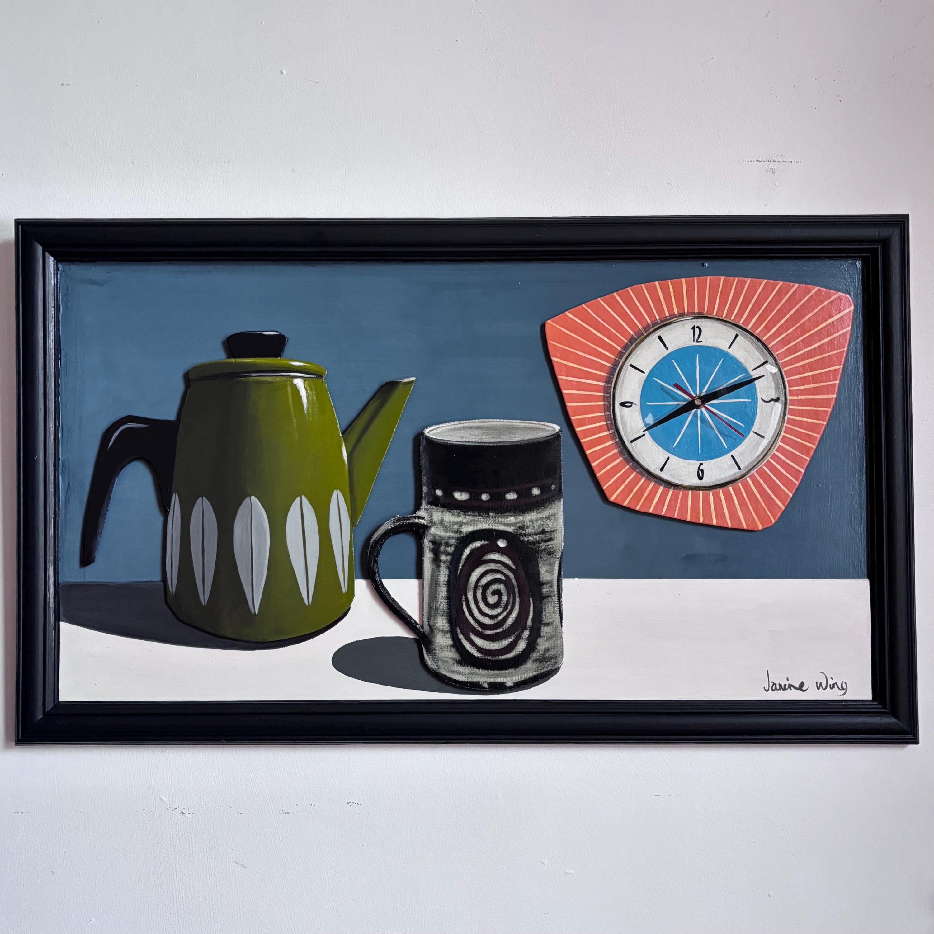 - Acrylic on board. Objects are cut out and mounted on board for 3d effect.